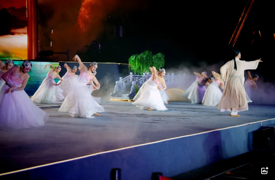 《烟雨横江》将齐云山的美景尽收眼底。舞台上,舞者们轻盈起舞,如同山间云雾,又似江面波光,将齐云山那份独有的温婉与壮丽展现得淋漓尽致。每一幕,都是一幅流动的山水画,让人沉醉不已。《逍遥齐云》则是一次文化的深度触碰。徐霞客的探秘之旅、朱熹的哲理沉思、唐伯虎的浪漫情怀,三位历史名人的诗歌在舞台上生动再现。舞者们通过肢体语言,将文人墨客对齐云山的那份热爱与向往,化作一曲曲动人的诗篇,引领观众步入一个充满诗意与哲思的世界。