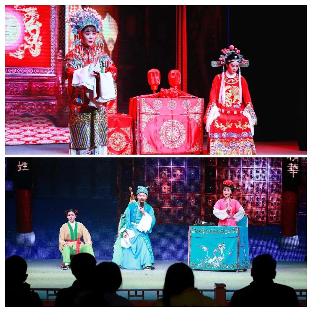 整场演出以黄梅戏经典传统剧目《女驸马》选段“洞房”华丽开场,舞台上戏曲表演者华美的服饰、优美的唱腔、反转有趣的故事情节一下子就吸引住了营员们;经典唱段《对花》《十五的月亮为谁圆》节奏明快、委婉动听,让大家沉醉在黄梅戏悠扬的曲调之中;经典折子戏《戏牡丹》语言诙谐幽默、情节跌宕起伏,精彩的表演让营员们忍俊不禁……。演出让营员们沉浸式体验了黄梅戏的魅力,台上鲜活的人物形象和灵活的表演形式引来阵阵掌声。